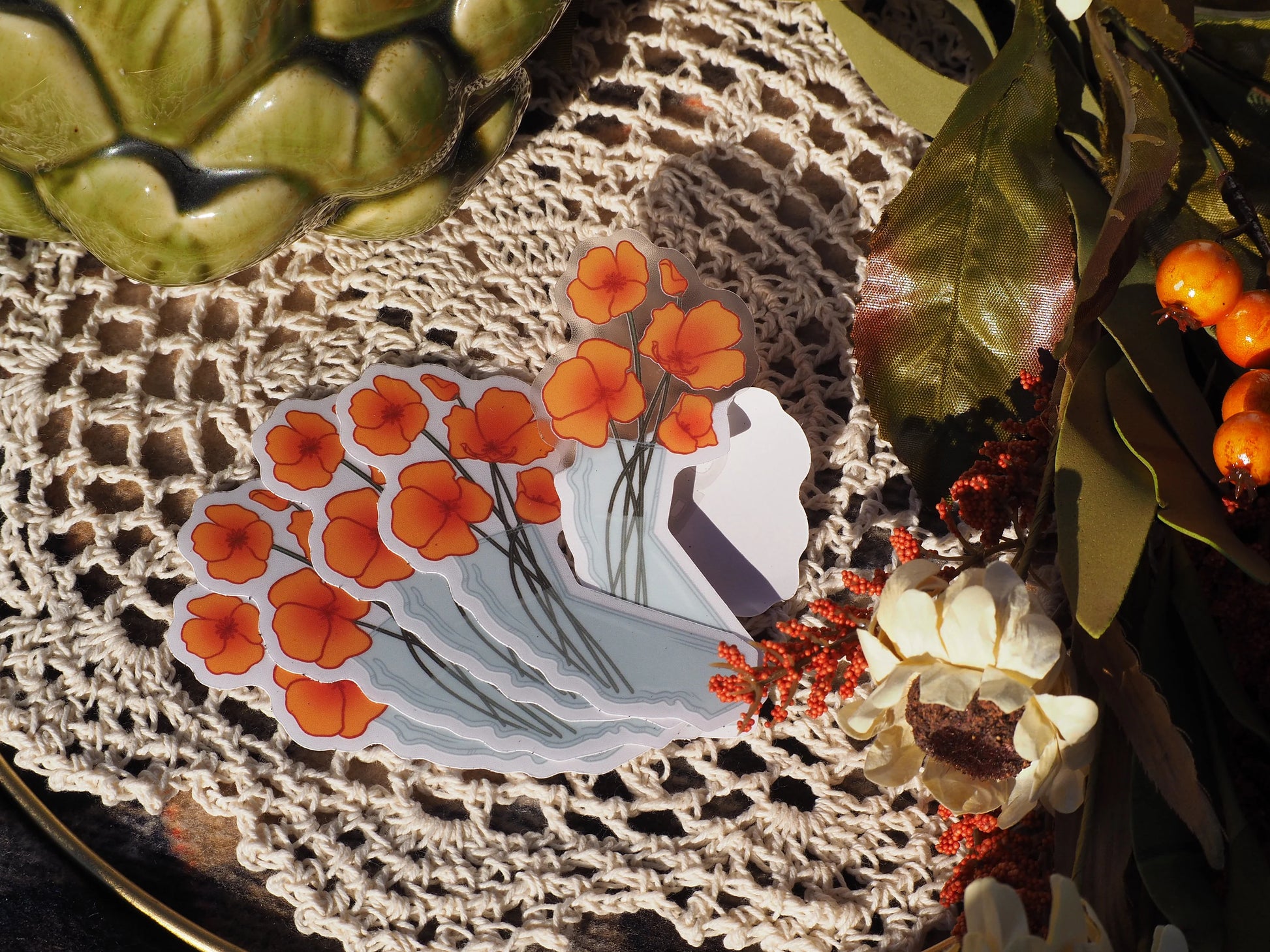 California Poppy flowers in a vase shaped like California. California Poppy is the California state flower. It became the state flower in 1903. The flower's bright orange pedals are a symbol of the Golden State. Viewed as a floral representation of the “fields of gold” sought during the gold rush.
